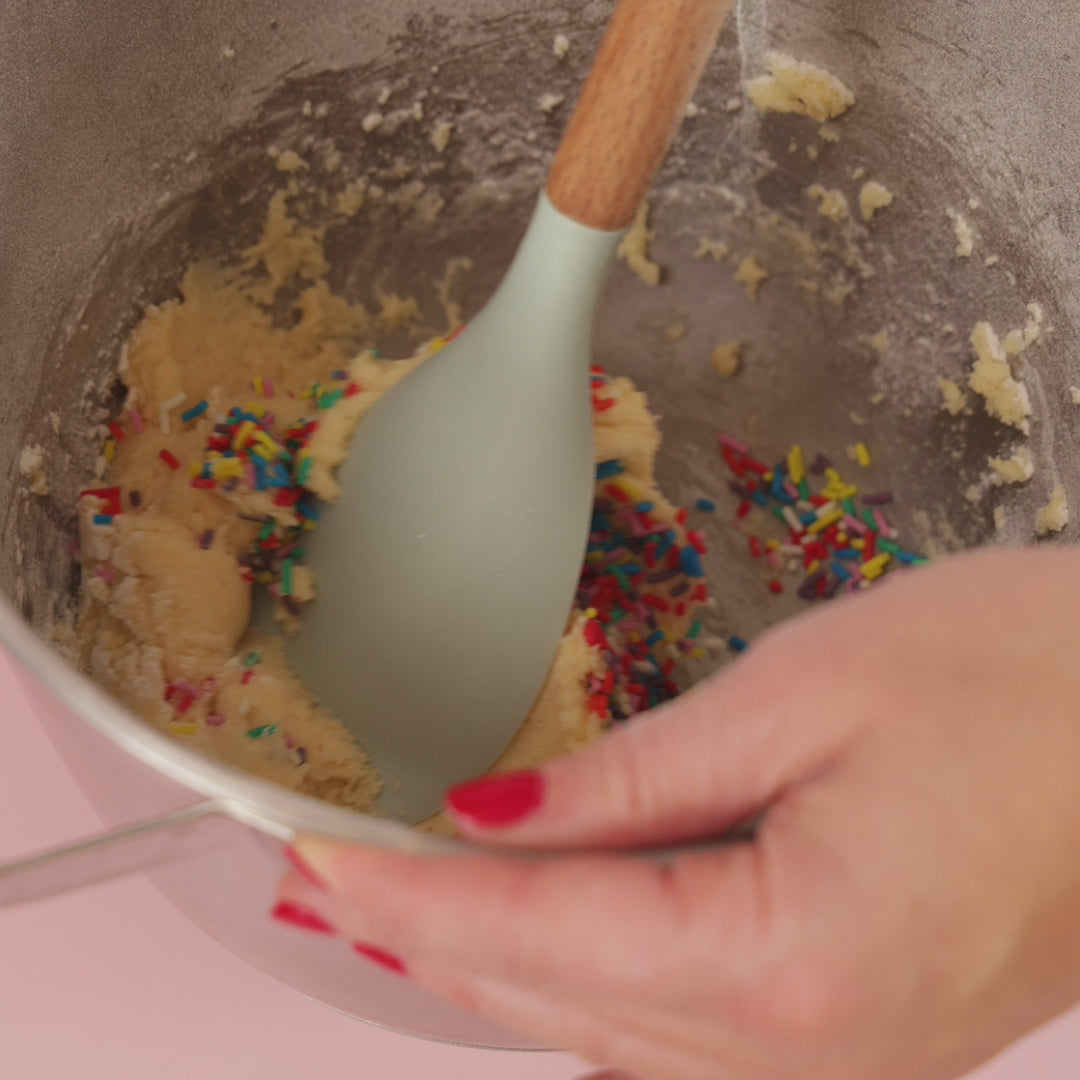 Alles gut verrühren und anschließend die Funfettis unterheben. Nun 8 Kugeln formen und diese 12-15min bei 180 Grad backen. Und schwupps, sind die leckersten Cookies fertig und du hast das bunteste Mitbringsel! 😋