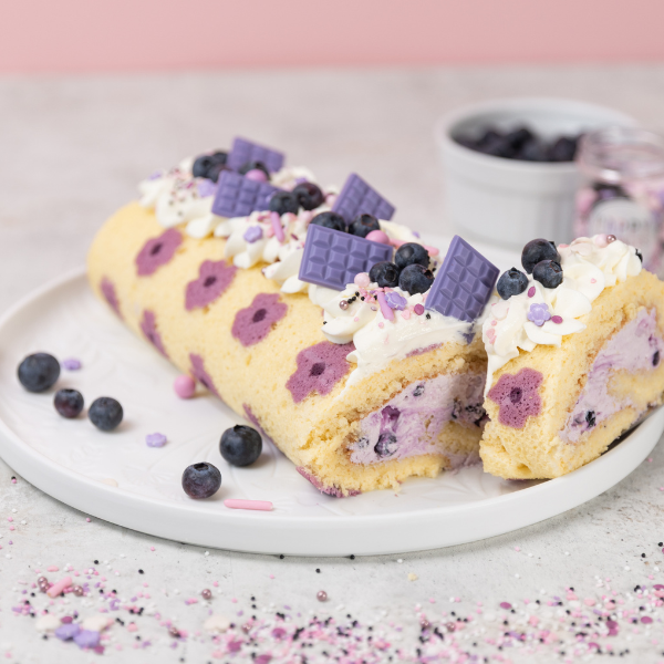 Blaubeer-Biskuitrolle mit Blumenmuster